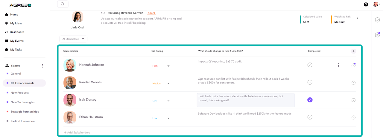 If desired, select the gray dots at the far right of each row to see any additional details and input from the Stakeholder.