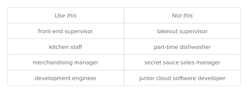 Use generalized terms instead of detailed HR or industry language. (See photo)